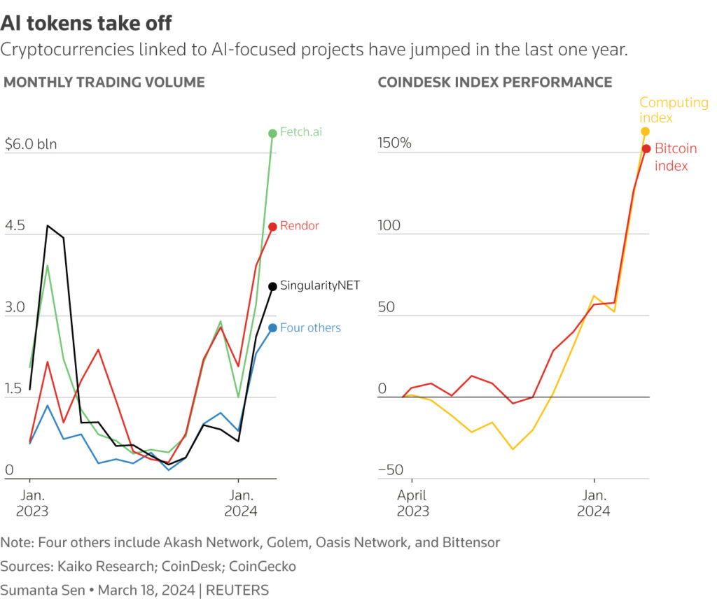近年、AI関連の暗号通貨はビットコインや他の主要な仮想通貨を上回る成長を見せています。例えば、2023年にはAIトークンがアルトコイン市場をリードし、多くの銘柄が急騰しました。特に、分散型コンピューティングプラットフォームであるRender(RNDR)や、機械学習プロトコルであるBitTensor(TAO)などが急上昇しています[2][4]。 - AIとブロックチェーンのシナジー