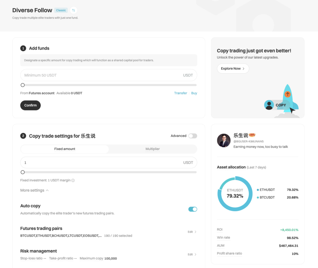 - 投資設定: 選んだトレーダーに対して、投資する金額(最低50 USDT)やリスク管理パラメータ(利食い率や損切り率など)を設定します[5]。