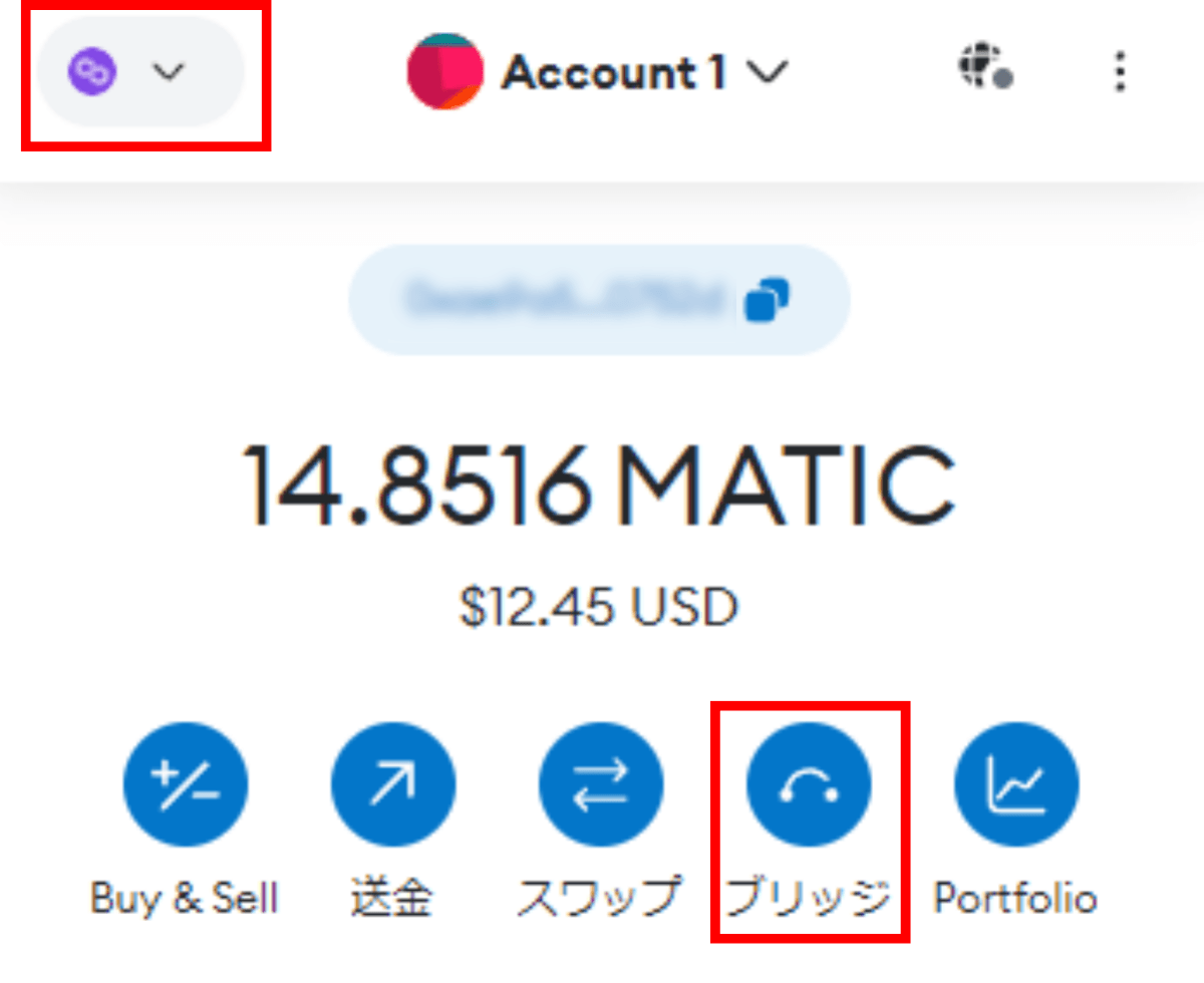 Polygonネットワーク上で保有しているトークンをブリッジしたい場合は、MetaMaskのネットワークがPolygonに設定されていることを確認のうえ、ブリッジしたいトークンを選択した状態で「ブリッジ」をクリックします。